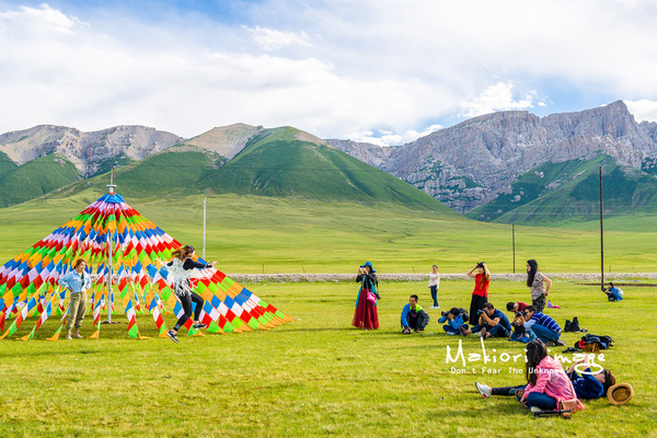 天峻山下面就是一望無際的天峻草原,在這里有不少藏民在此生活順便接待游客。天色還早,我和我的小伙伴們就在此拍照嬉戲。高原的寬曠真的能讓人從壓抑的城市生活中解放出來,盡情的抒發自己的情懷和展現自己。