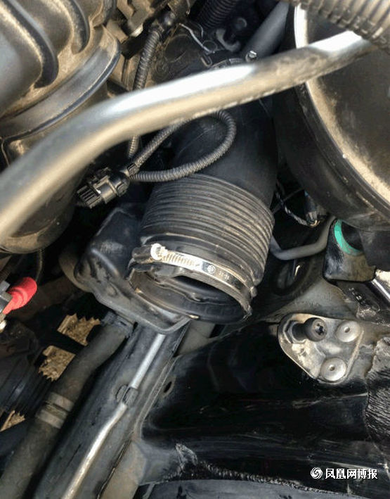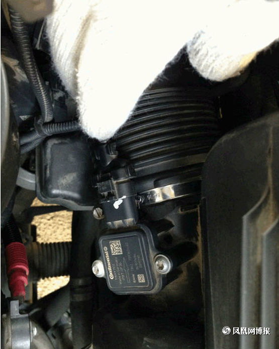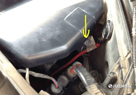 接下來就是要準備拆下空氣濾芯了,第一次拆的童鞋要注意了,圖中標出來的就是連接空氣濾芯的接口,不要像我這樣拽了半天也沒拔出來,原來這上面有個小機關,有個凸起的小開關左手往下按的同時右手往后面拉,它就出來了。(另外,告訴大家,在經過行駛后停車的拆裝的童鞋要等車子發動機冷卻后再動手,不讓帶了手套,你還是會覺得旁邊的發動機很燙,會不小心被燙到。)