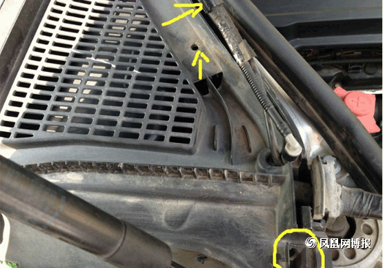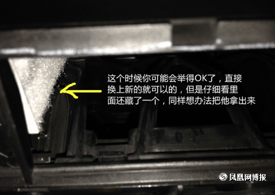 接下來我們再來拆接外部的空調濾芯, 黃色標出的地方就是機關所在,圓圈的部分就只要用手指一捏就可以松掉提起,箭頭部分是拔出來后的樣子,所以童鞋們不用擔心用力一拔就可以了。