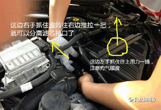 這個時候右手抓住圓筒向右邊用力推,這時候筒口就跟濾芯接口分開了,左手抓住空氣濾芯上面往上提就可以拿出來了。簡單吧!
